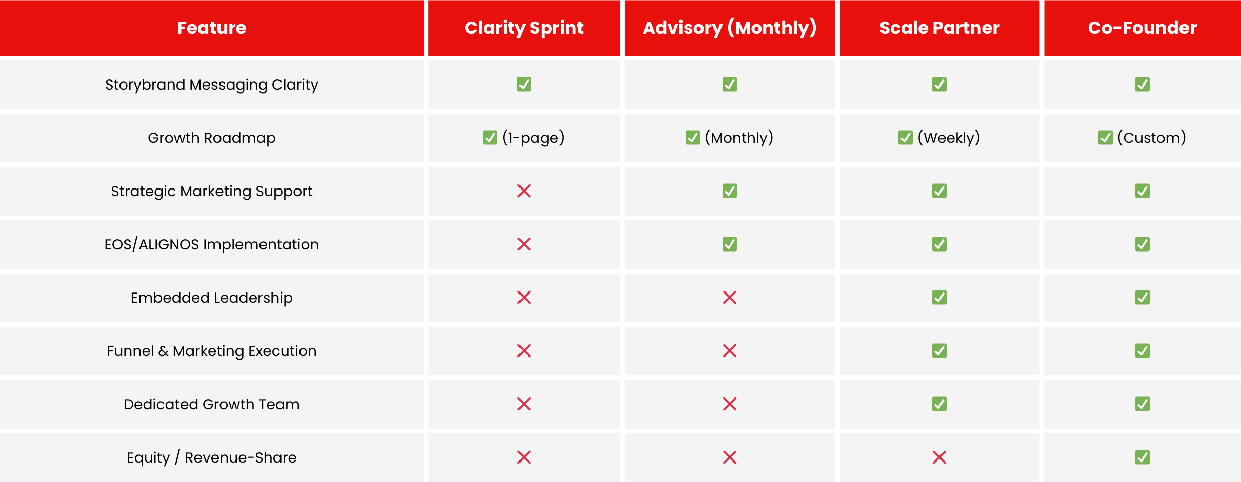 Explore the features included in each package to find the engagement that best fits your vision, resources, and growth goals.